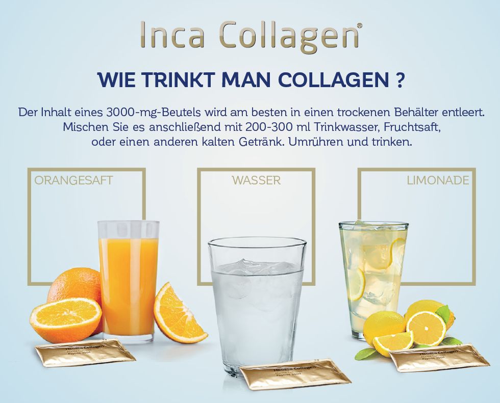Sollten Sie mit Inca Collagen anfangen, ist es wichtig die dreimonatige Kur zu absolvieren. Diese Kur umfasst eine regelmäßige Einnahme des Präparates. Täglich 1 Beutel. Der Inhalt wird in 200-300ml Trinkwasser, Fruchtsaft oder Milch aufgelöst.